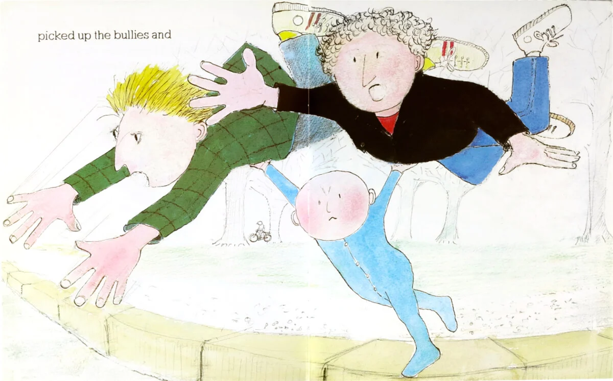 John Burningham, has concocted a perfect plot. Babies are often fussy eaters and mealtimes are often anxious. Just the idea of an intruder to the home is terrifying …and bullies in the park – outrageous!
